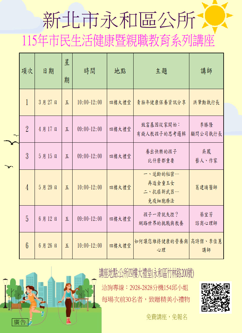 新北市永和區公所115年市民生活健康暨親職教育系列講座課程安排表